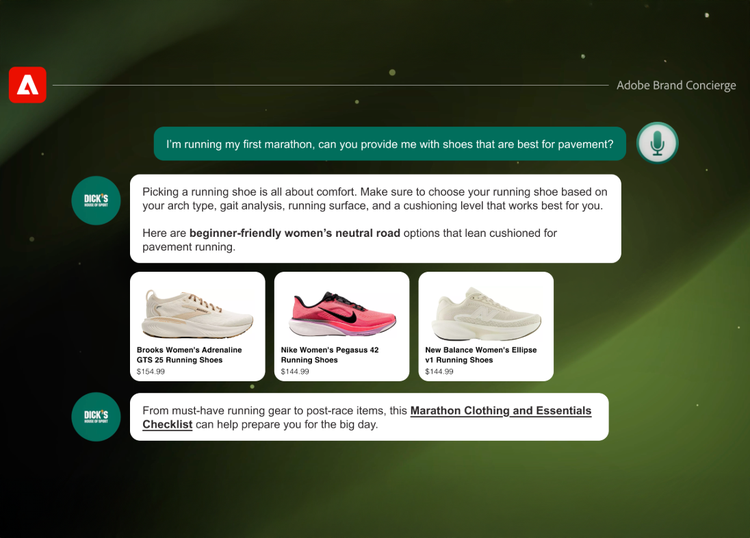 - Agent-powered conversational experiences: Consumers are embracing LLM interfaces to discover and engage their favorite brands. Data from Adobe showed that during the 2025 holiday season, AI traffic to retail sites (users clicking a link) jumped 693% year-over-year, as shoppers engaged with AI to locate specific products or find deals. DICK’S will leverage Adobe Brand Concierge to address this shift in consumer preferences, delivering immersive conversational experiences on its mobile app. AI agents (acting as digital coaches) will guide DICK’S athletes in their journey from personalized product recommendations informed by specific athlete needs to tailored training tips. Anchored in timely and relevant data, teams can also ensure that every agent interaction is customized and reacts to athletes’ changing preferences.