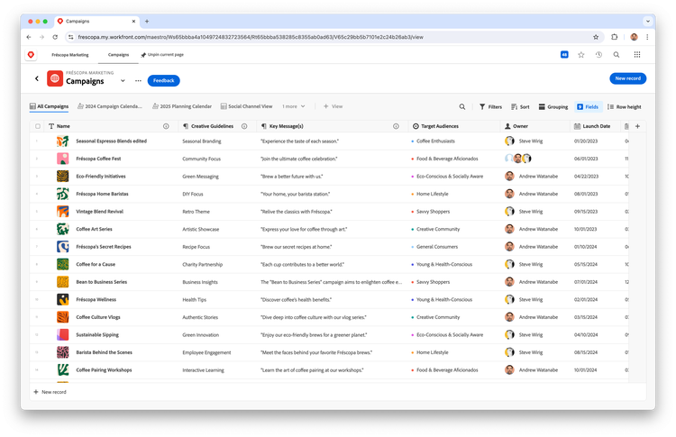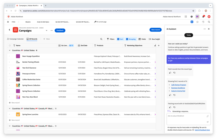 Instead of manually gathering details across teams, Workfront Planning allows marketers to quickly answer questions such as “How many campaigns are we running this year?” or “Which tactics are most frequently used in our campaigns?”. Users have these actionable insights right at their fingertips, surfaced through both curated visualizations and a generative AI-powered conversational interface. This can dramatically shorten the time it takes to plan and launch new campaigns, removing the labor-intensive work of aligning teams on timing and objectives. Users can also accelerate time-to-market by leveraging generative AI to summarize information, keep marketing records up-to-date or quickly set up new campaigns.
