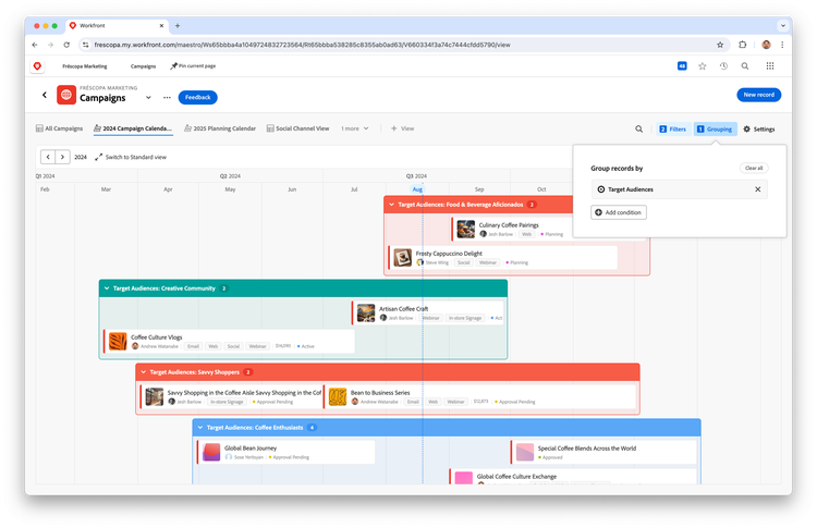 - Curated visualizations: The marketing calendar in Workfront Planning visualizes day-to-day marketing work in an easy-to-digest format. For instance, a timeline view displays all active campaigns in a chronological format that is customizable for any team or stakeholder. A user can automatically view campaigns targeting a certain audience (e.g., loyalty program members) or for a specific objective (e.g., holiday season promotion). A spreadsheet view provides a deeper look into each campaign, providing end-to-end visibility on key messages, individual contributors, project status and more.